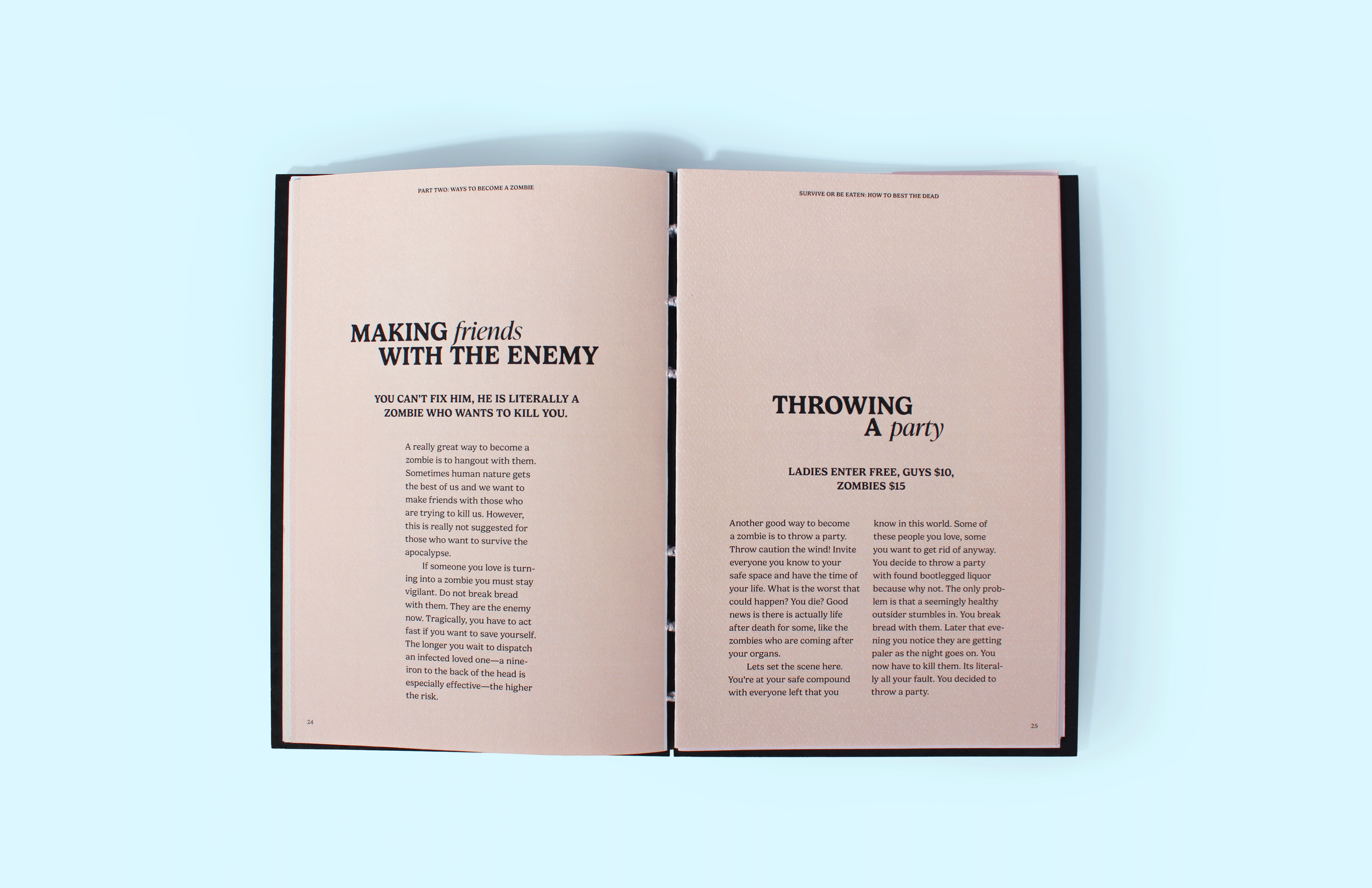 I decided to create a zombie booklet that altered the stereotypical zombie aesthetic. I wanted to make this survival guide completely satirical. I did this through pastel colors, retro and classy mixed typography, as well as fun type content.